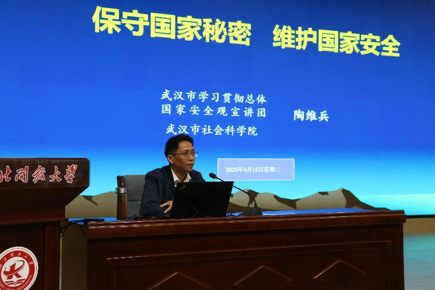 4月15日,学校开展“国家安全知识进校园”主题教育活动,邀请武汉市学习贯彻总体国家安全观宣讲团成员、武汉市社科院文化与历史研究所陶维兵所长到校开展专题讲座。讲座中,陶维兵结合详实的数据与真实案例,系统阐释总体国家安全观的核心内涵,深入剖析当前我国面临的安全风险类型,并就如何应对新挑战、新威胁,引导师生思考维护国家安全的责任与行动。与此同时,学校同步启动“共筑保密防线,师生人人有责”主题保密宣传教育月活动。通过播放保密公益宣传片、张贴宣传海报等方式,全方位营造浓厚的保密宣传氛围;组织开展形式多样的理论学习活动,引导师生深入学习保密法律法规与纪律要求,推动保密宣传教育走深走实、入脑入心。