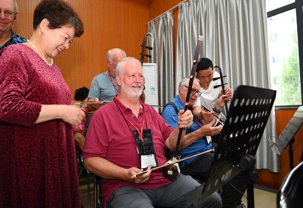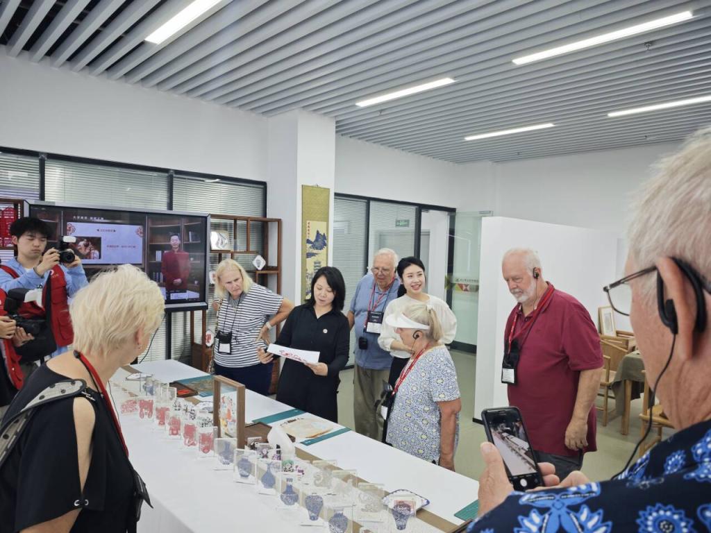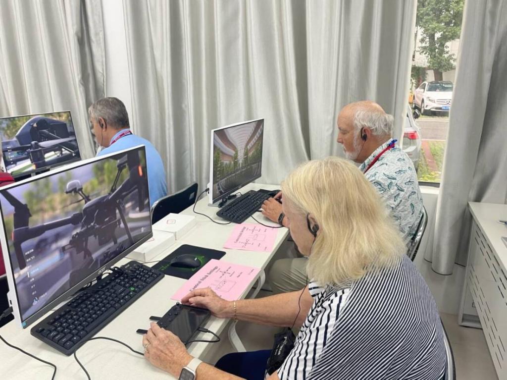 在社区教育学院,美国老年研学团走进湖北老年教育智慧课堂,亲身体验了智慧书法、无人机摄影、茶艺品鉴、钢琴、模特、古筝等特色教学课程。在智慧书法课堂,研学团学习如何手执毛笔,在数字化临摹屏上一笔一画勾勒汉字轮廓,教学系统实时捕捉运笔轨迹,从笔锋力度到结构比例进行智能评分,开启了一场融合传统文化与现代科技的学习体验;在无人机摄影教室,研学团手持操控手柄,随操控指令变换视角,科技赋能下的教育体验让他们眼中闪烁着兴奋的光芒;在茶艺教室,茶艺指导老师演示了中国传统泡茶工艺,讲解了湖北“茶圣故里”的文化渊源,让老年学者亲手体验了分茶、奉茶的礼仪,在茶香氤氲中感受东方生活美学的哲思。