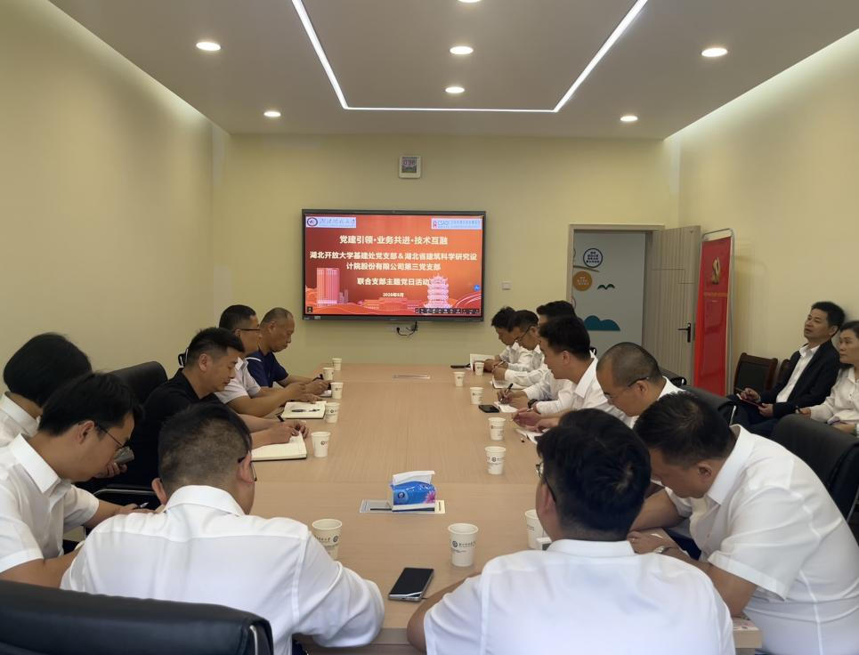 本网讯(通讯员 李梦琪 文/图 )5月28日下午,基建处党支部联合湖北省建筑科学研究设计院股份有限公司第三党支部开展“党建引领、业务共建、技术共融”党日活动。基建处负责人、湖北省建筑科学研究设计院股份有限公司党委委员、副总经理邵兴宇、基建处全体党员及湖北省建筑科学研究设计院股份有限公司党员代表参加了此次活动。